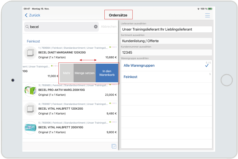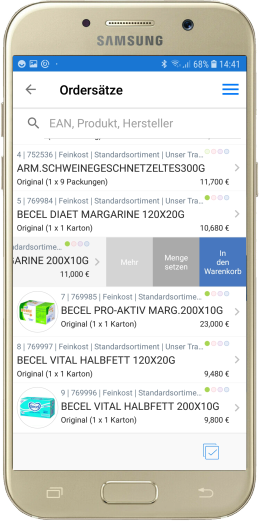 MIt Auswahl des Navigationspunktes Ordersätze, wechseln Sie in die Ansicht Ihrer freigeschalteten Sortimente.