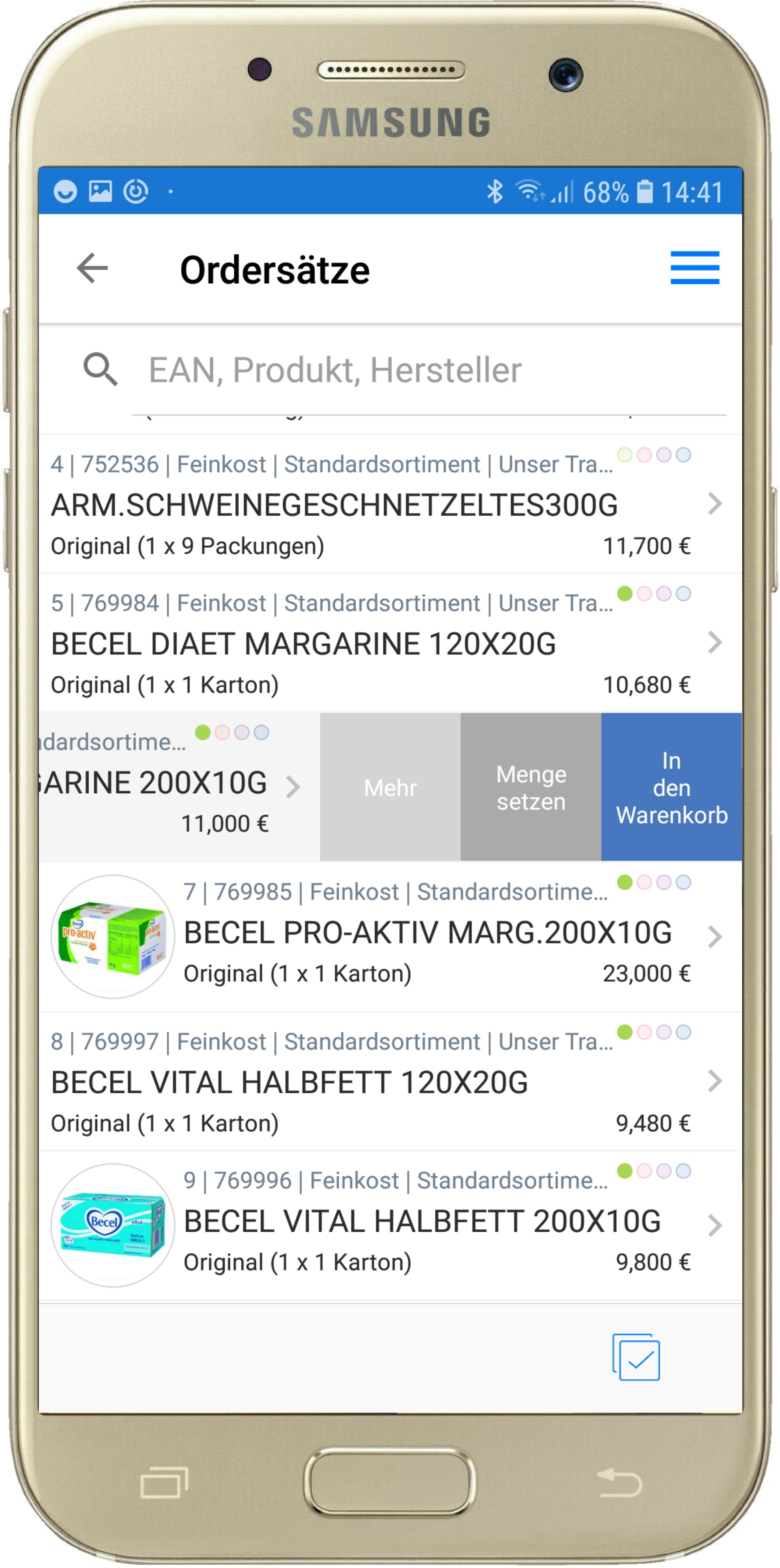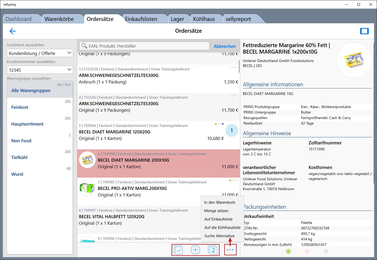 (Artikel in Einkaufs- und Kühlhausliste und Warenkorb übernehmen, Bestellmenge eintragen)