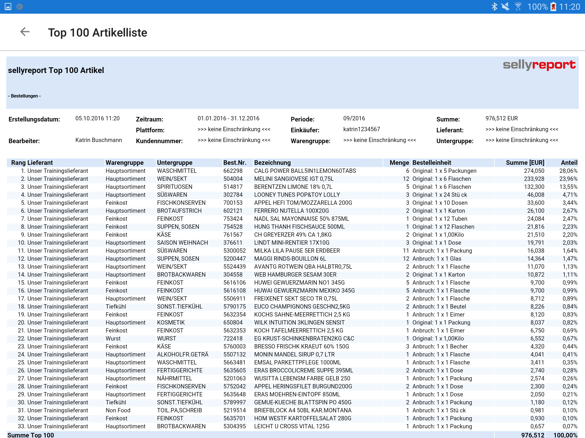 Mögliche Reports sind die Periodenauswertung (horizontal/vertikal), die Top 100 Artikelliste, die Flop 100 Artikelliste, den Jahresvergleich und die Budgetauswertung (letzter Bericht benötigt zusätzliche Freischaltung).