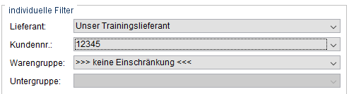 Nach Festlegung der gewünschten Auswertungsperiode können Sie die verschiedenen individuellen Filter (s. o. Markierung 2) Lieferant, Kundennummer, Warengruppe und Untergruppe (sofern Warengruppen beim Lieferanten hinterlegt sind) durch einfaches Anwählen setzen.